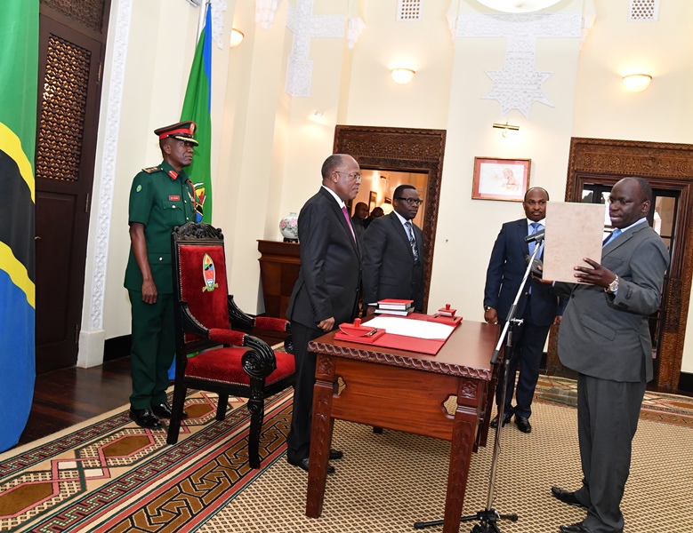 Dkt. Cosmas Mwaisobwa, Msaidizi wa Makamu wa Rais (Hotuba) akipokea Kitambulisho cha Uandishi wa Habari (Presscard) kutoka kwa Kaimu Mkurugenzi Mkuu wa Bodi ya Ithibati ya Waandishi wa Habari (JAB) Wakili Patrick Kipangula.