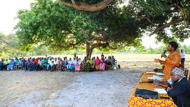 Naibu Waziri wa Ardhi Nyumba na Maendeleo ya Makazi Dkt Angeline Mabula akizungumza na wananchi wa Baleni wilayani Mafia mkoa wa Pwani alipokwenda kusikiliza kero za ardhi katika eneo hilo akiwa katika ziara yake ya siku mbili katika wilaya hiyo kuhamasisha ukusanyaji maduhuli ya serikali kupitia kodi ya ardhi pamoja na kukagua masijala ya ardhi jana.
