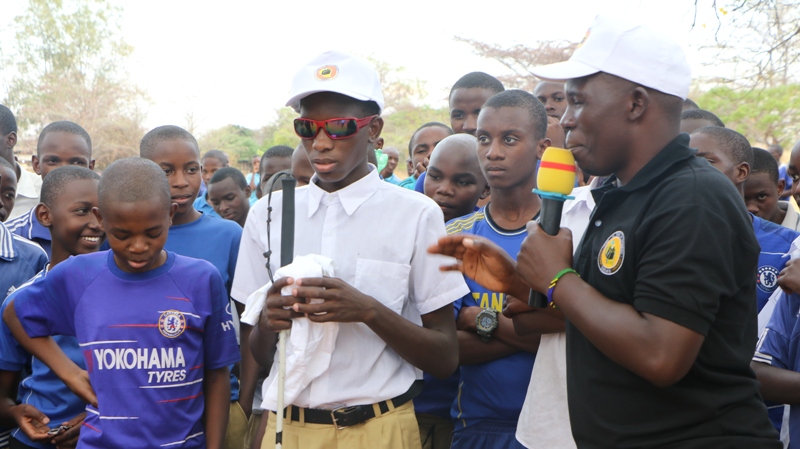 Kaimu Mkurugenzi Msaidizi wa Idara ya Habari na Elimu ya Mpiga Kura ya Tume ya Taifa ya uchaguzi (NEC) upande wa Habari Daniel Kasokola, akieleza jambo mbele ya mwanafunzi mwenye ulemavu wa macho wa Shule ya Sekondari Tabora Boys Elisha John kuhusu kipaumbele ambacho NEC inakitoa kwa makundi maalum wakiwemo watu wenye ulemavu.