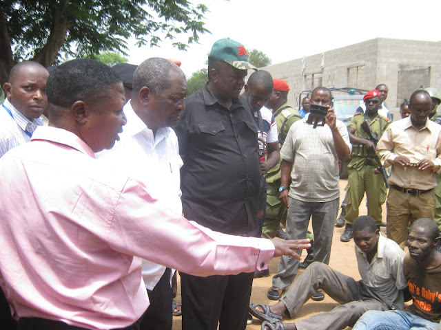 Mkuu wa Mkoa wa Simiyu Elaston Mbwilo akionyeshwa watuhumiwa wa ujangili ambao walihusika kutungua Helicopter.