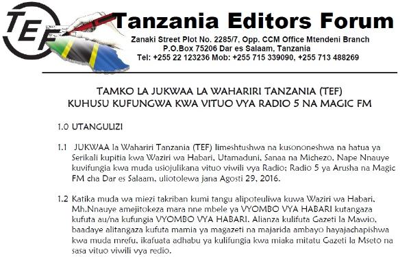 1.4 TEF inachukulia hatua hii kama mwendelezo wa ukandamizaji wa uhuru vyombo vya habari nchini na tunashindwa kuelewa dhamira ya serikali ya awamu ya tano kwa sekta ya habari nchini. Kinachoonekana ni kutumia kila aina ya sheria iliyopo kukandamiza uhuru wa vyombo vya habari. Kimsingi TEF hatuoni nia (spirit) wa malezi katika uamuzi wa waziri huyo.
