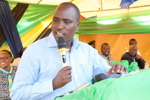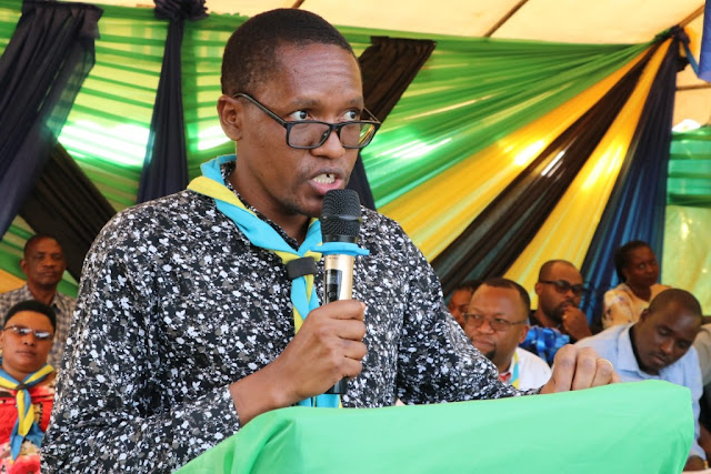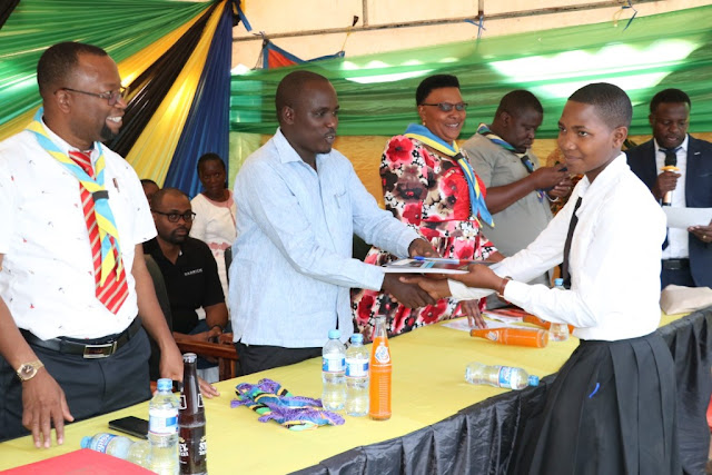 Kijana wa Skauti akimvisha Skafu Mgeni Rasmi, Mbunge wa Jimbo la Bukombe mkoani Geita, Doto Biteko.