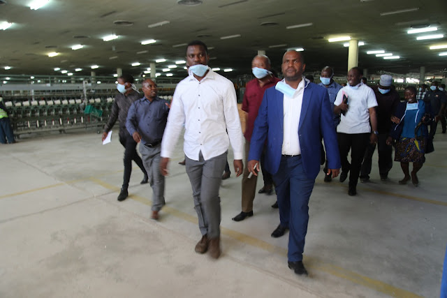Waziri wa Viwanda na Biashara Innocent Bashungwa (aliyeshika uzi) akipata maelezo kutoka kwa Katibu wa Kiwanda cha Nyuzi Tabora Pascal Jotham (mwenye shati nyeusi) leo alipokuwa Mkoani Tabora kukagua viwanda mbalimbali. Waziri huyo hauridhishwa na utendaji wa kiwanda hicho na kuahidi kupitia Mkataba wa Ubinafishaji wake.